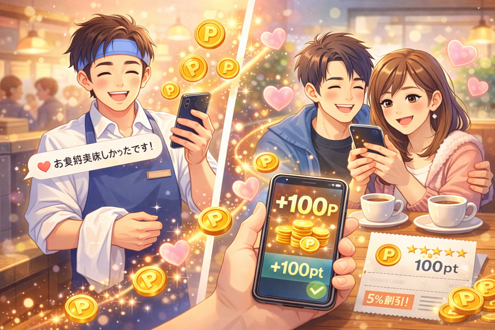 ともさかエールでは、アプリにログインしてもしなくても、気になったスタッフにそのまま「ひと言メッセージ」や「チップ」を送れます。 そして、お店のアンケートに答えて口コミ投稿すると、会計で使えるポイントももらえ…